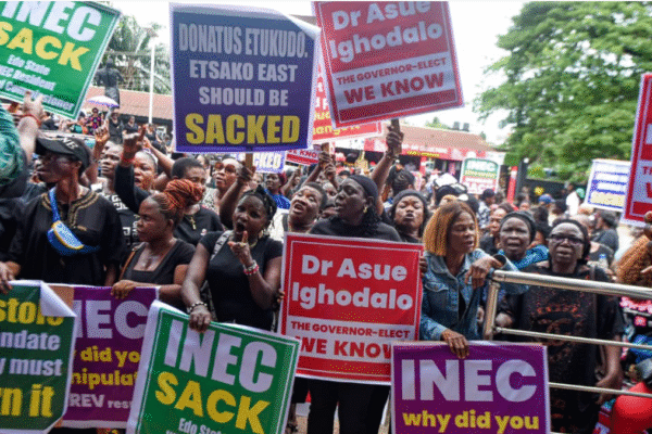 Peoples Democratic Party (PDP) women in Edo State, Tuesday, stormed the streets of Benin City, capital of Edo State in their thousands to protest and express their dissatisfaction with the way and manner the Independent National Electoral Commission (INEC) conducted the last governorship election in Edo State, saying Dr. Asue Ighodalo, candidate of the party…