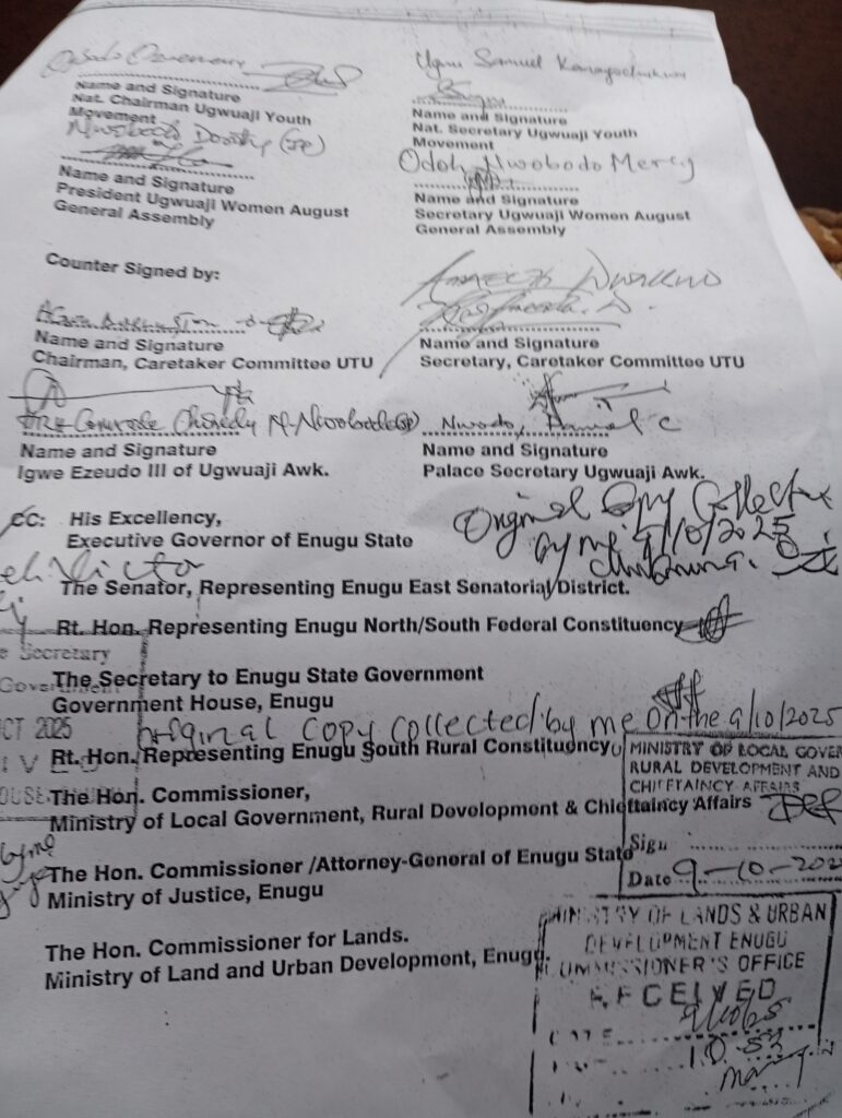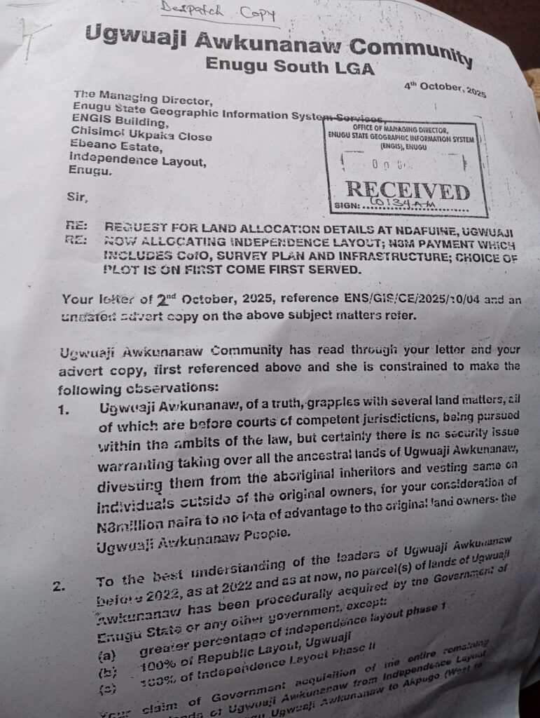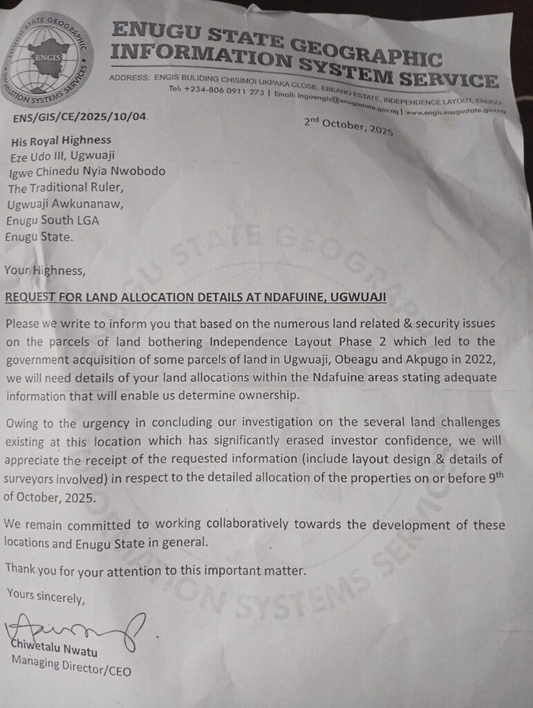 They made the appeal in a letter written to the managing director of Enugu state geographic information system servive ( ENGIS) Chiwetali Nwatu, in response to the letter he earlier wrote to the traditional ruler of the Community on 2nd October,2025, captioned: ‘Request for land allocation details at Ndafune, Ugwuaji,with reference number, ENS/GIS/ CE/ 2025/10/04.