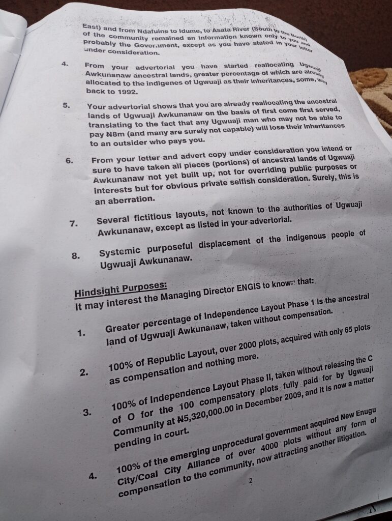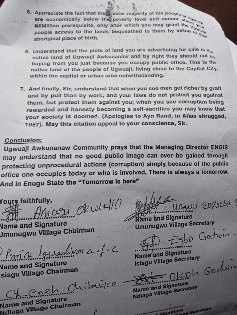 In their reply to the letter from ENGIS, the community emphasised that the land advertised for sale ” is the native land of Ugwuaji Awkunanaw”.